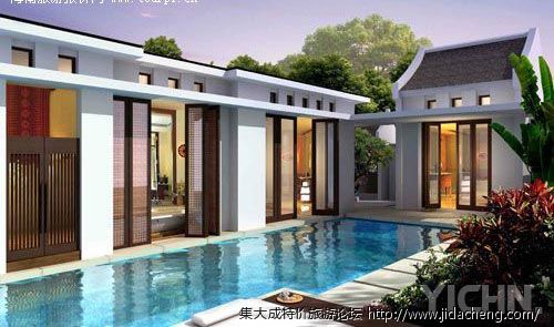 别墅内不很宽敞很漂亮, 有独栋客厅, 单独的衣物间,单独淋浴间, 单独厕所间,超大浴缸, 最好的是有一个很大的私家游泳池, 池边还有藤制躺椅,还有休息亭.